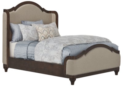 A curvaceous beauty, this brilliant upholstered bed wows with dramatic scalloped details and fanciful trim work and charms with a distressed chipped white finish for heirloom appeal.